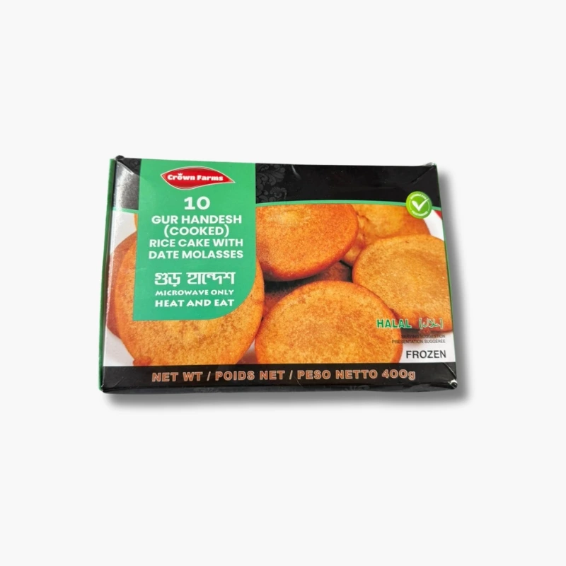 Crown Bangladeshi Khejur Gurer Shondesh is a traditional Bengali sweet made with premium-quality chhana (cottage cheese) and pure date palm jaggery (khejur gurer). This classic dessert delivers an authentic taste of Bangladesh, offering a rich aroma, smooth texture, and a naturally sweet, caramel-like flavour from real gur. Each 400g pack brings you handcrafted Shondesh that tastes just like homemade.