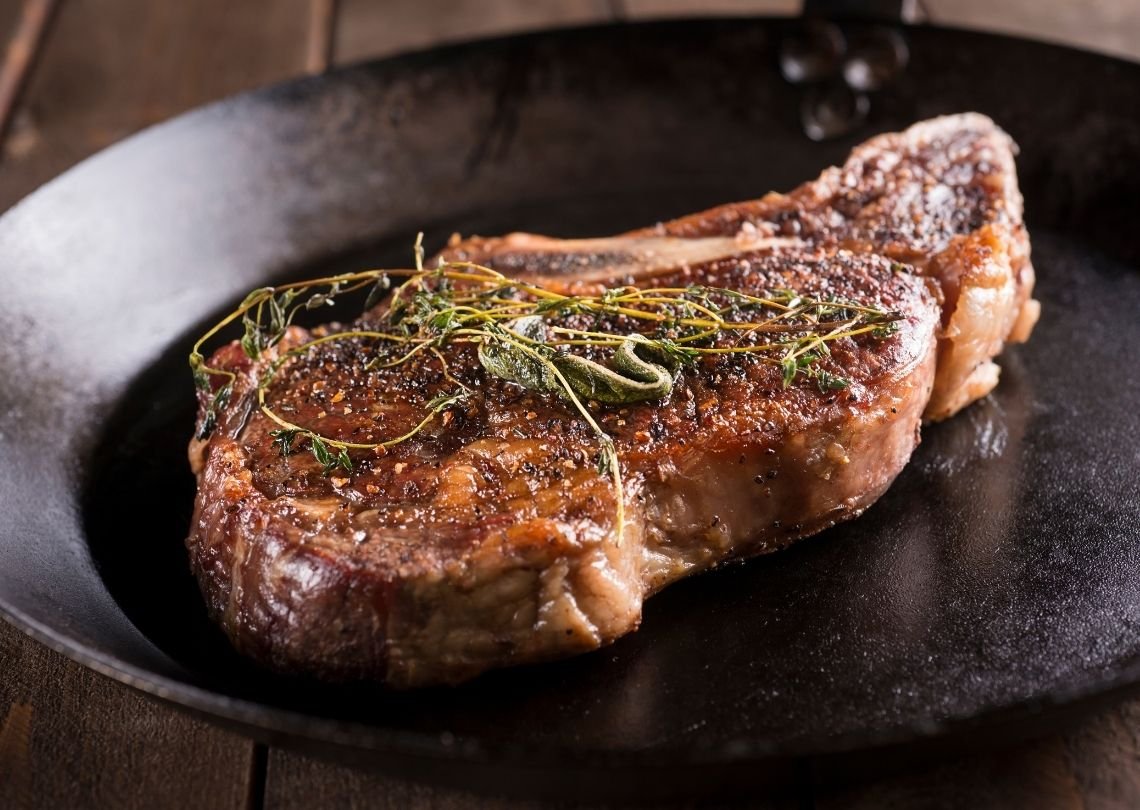 - Reduce heat to medium low. Push steak to one side of the skillet; add butter, garlic, thyme and rosemary to opposite side of the skillet, tilting the skillet towards the butter and cooking until butter is foaming, about 30 seconds to 1 minute.
